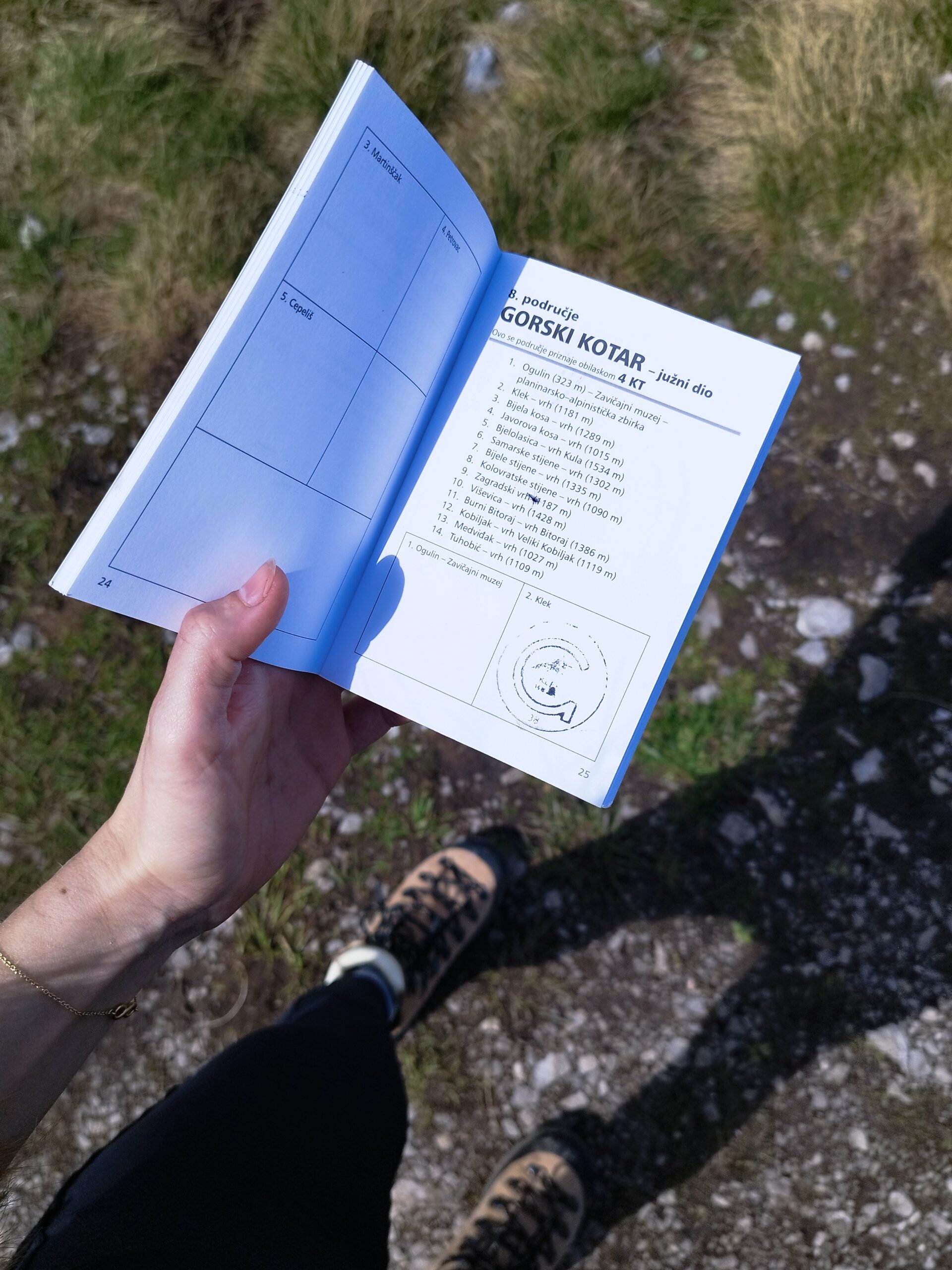 Pa tako se npr. područje GORSKI KOTAR – južni dio – 4 kontrolne točke sastoji od ukupno 14 točaka s najmanje potrebnih četiri kontrolnih točaka. Ja sam zasada obišla 3 KT ovog područja (Klek, Javorova kosa i Zagradski vrh). Ispenjala sam i vrh Bijelih stijena 1335 m n.v., ali bez knjižice u ruksaku.