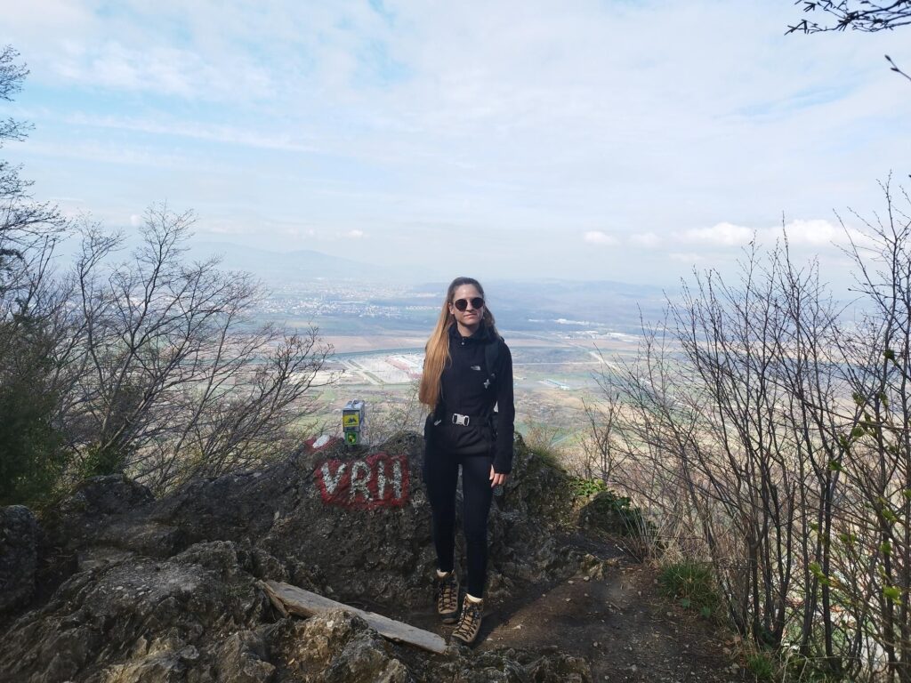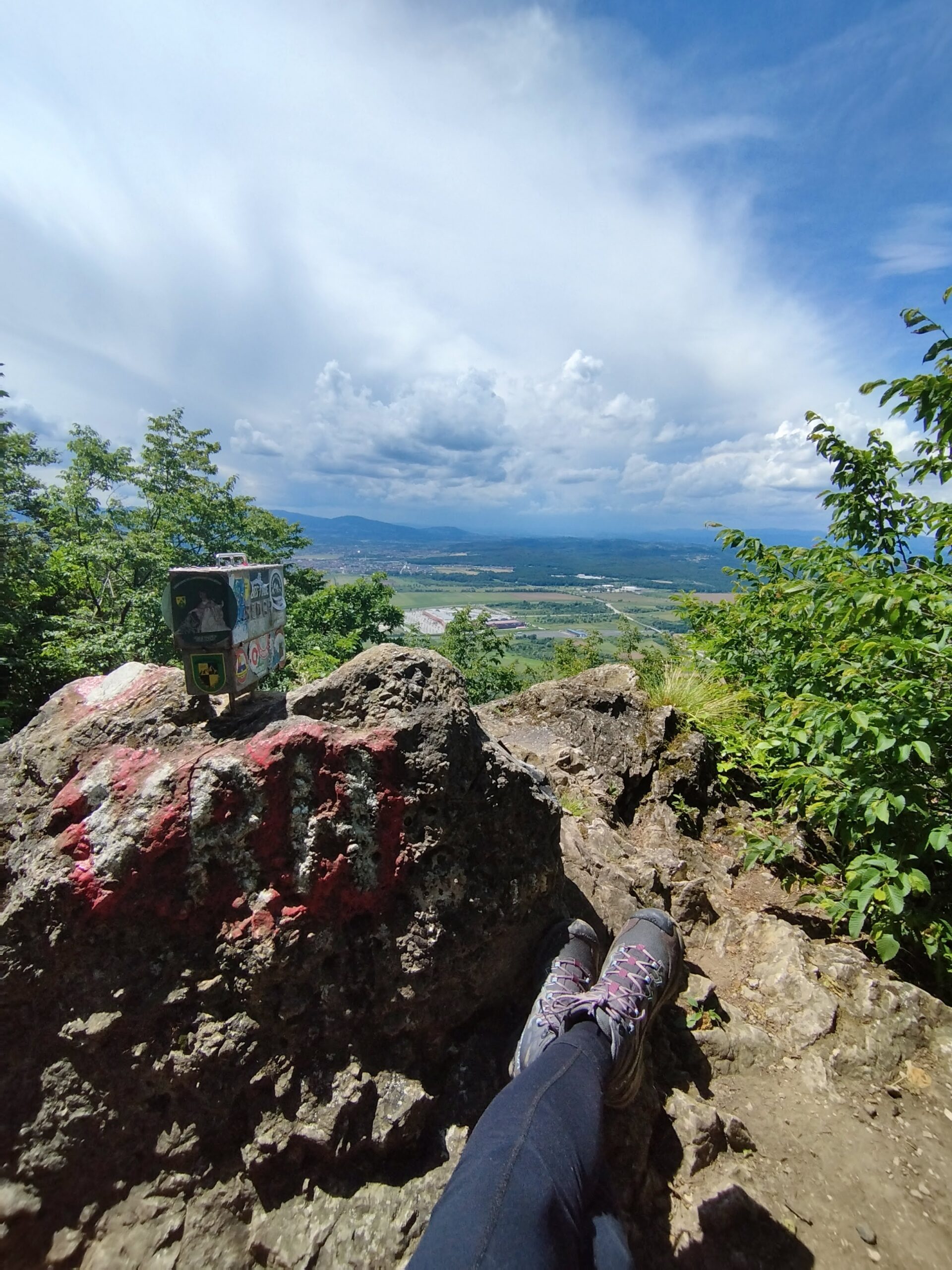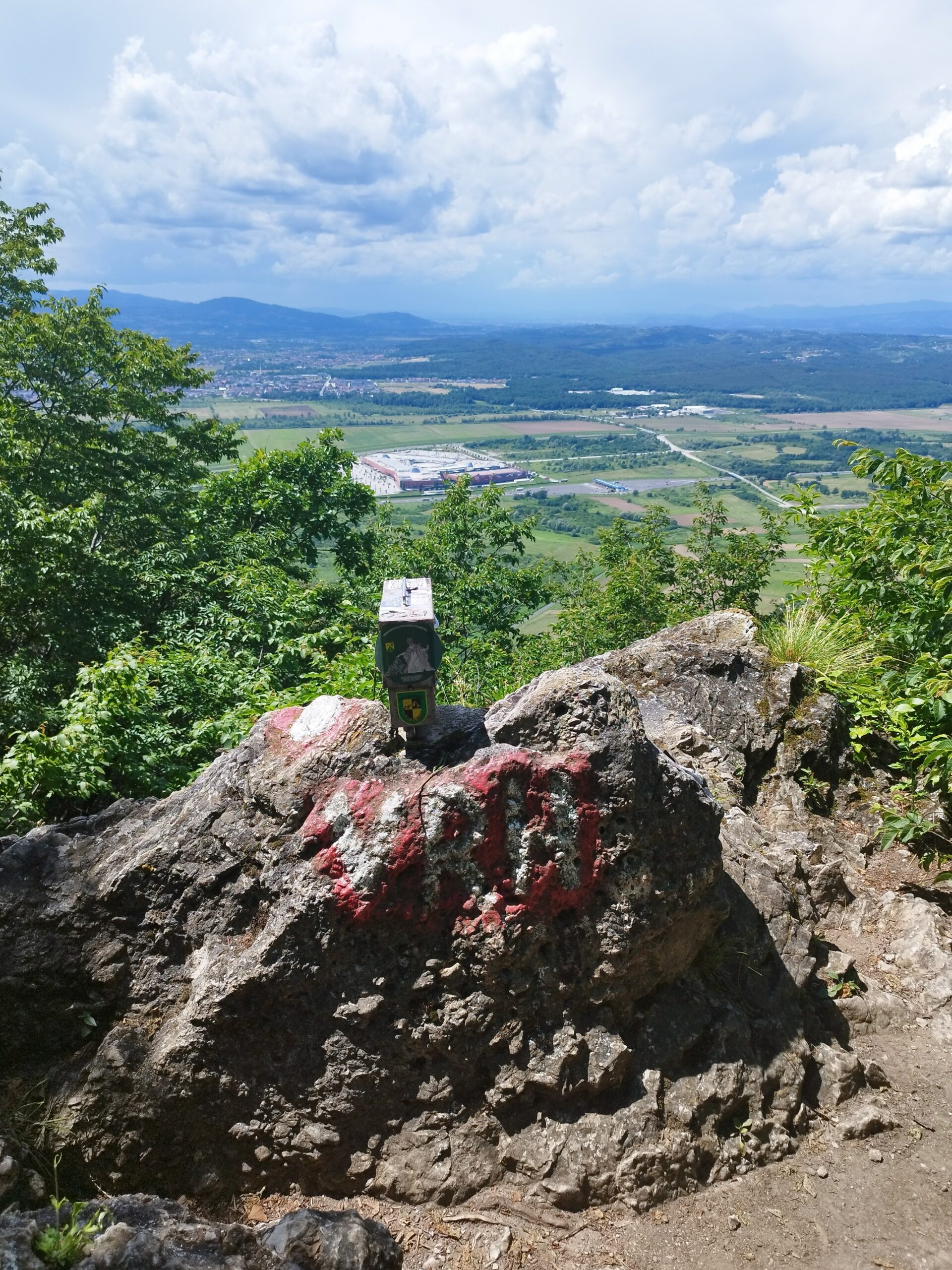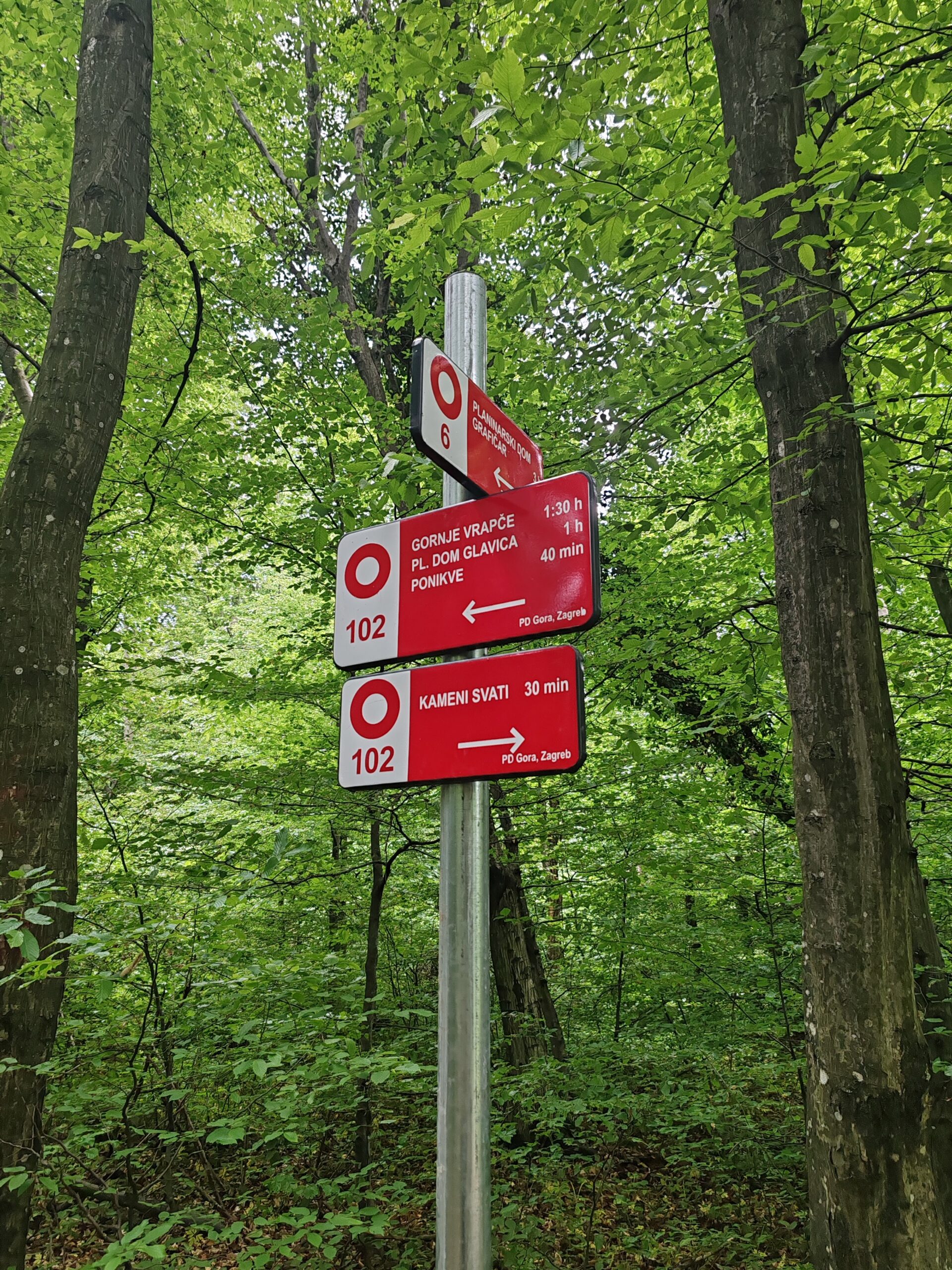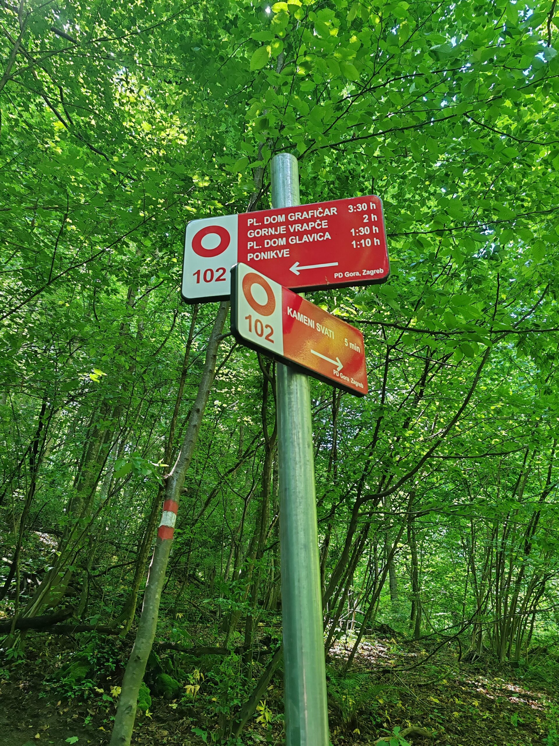 Od kuće dalje vodi staza 102 do vrha Kameni svati 483 m n/v. Vrh je također kontrolna točka HPO, a pruža pogled prema Zaprešiću i Westgate-u 😂 , no svejedno je lijepo. Na vrhu je također postavljena tabla s legendom o nazivu vrha koja kaže: „Udari me munja mahom, ak mi Janja bude snahom. A ti družbo na toj stijeni, kamenom se okameni“ – priča je o ljutitoj mlinarevoj ženi i njihovom sinu (ovo pitanje je bilo na Potjeri, čak 2 puta). Dalje put nastavlja do vidikovca s križem, a zatim dolje desno pa se stiže do raskrižja gdje je potrebno skrenuti lijevo. Ako bi se pak nastavilo ravno, došlo bi se ponovno do plan. kuće, ali putem podno vrha. Na raskrižju postoji i novopostavljeni putokaz što olakšava kretanje. Na putokazu na raskrižju stoji PD Glavica 1:30 h, zajedno s ostalim pravcima.