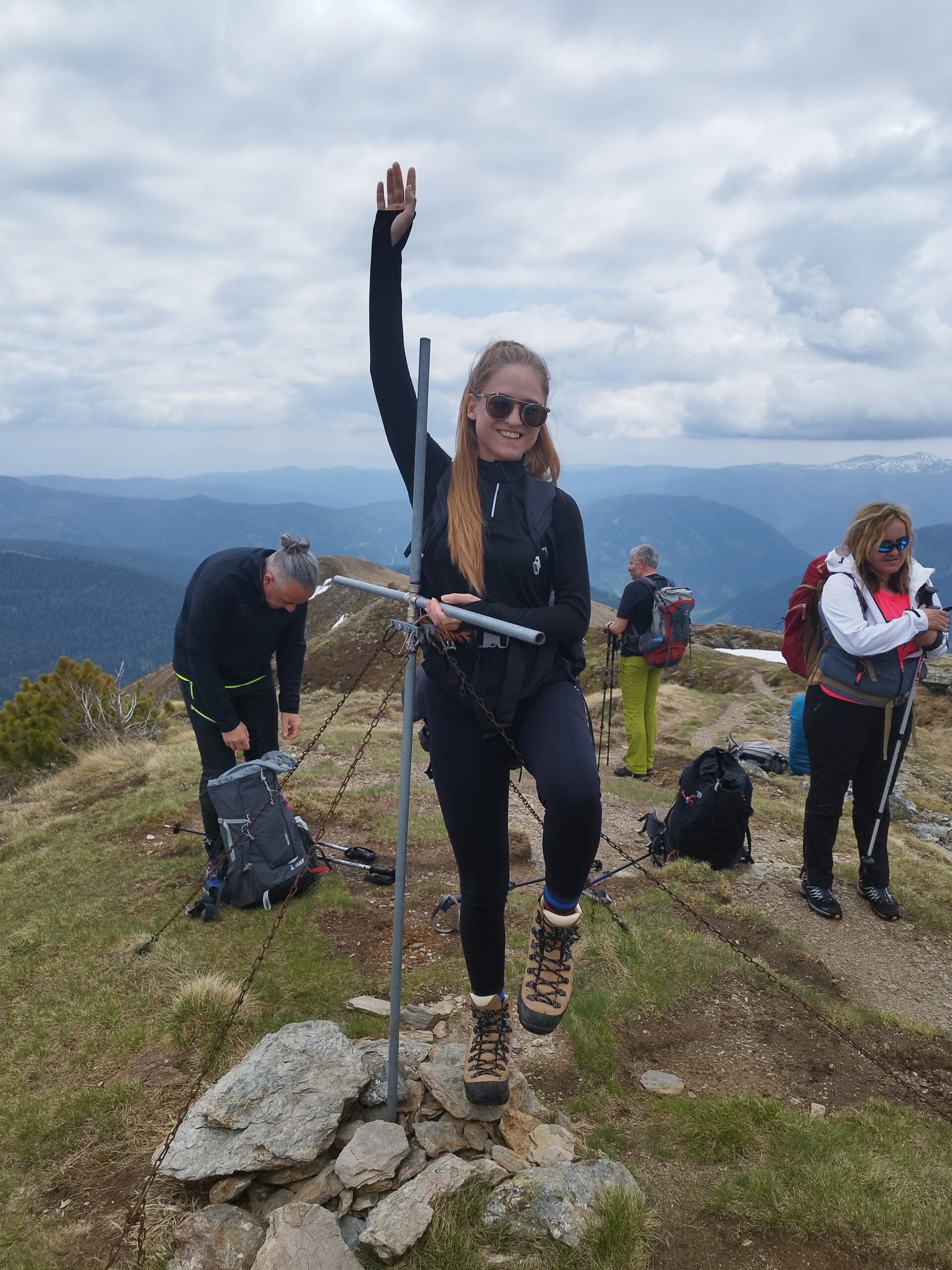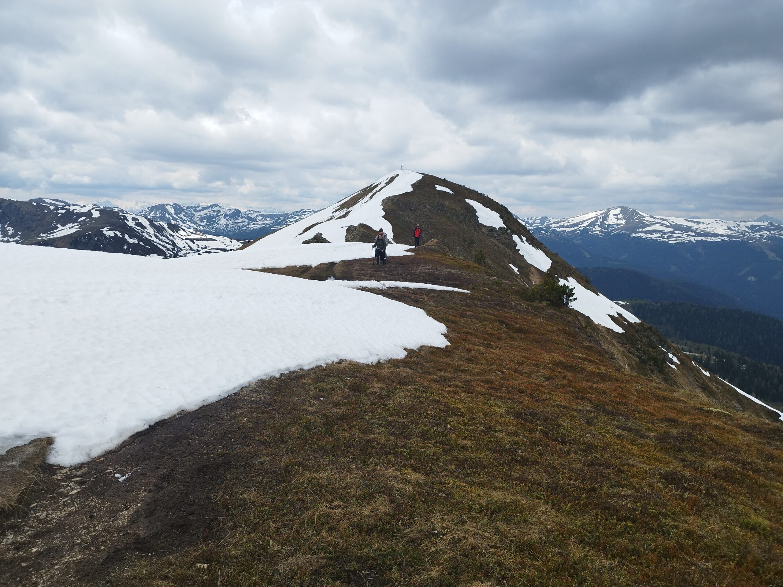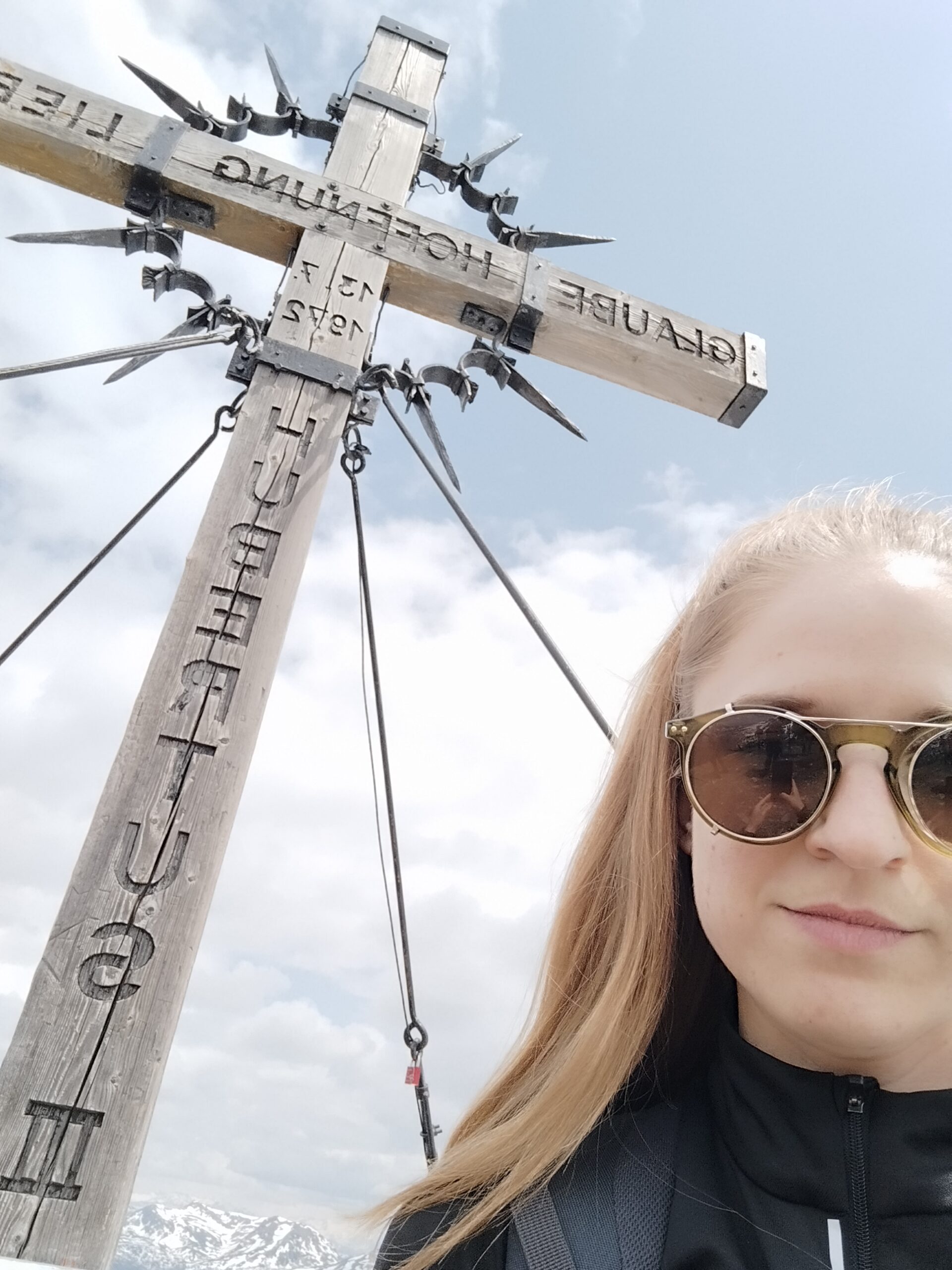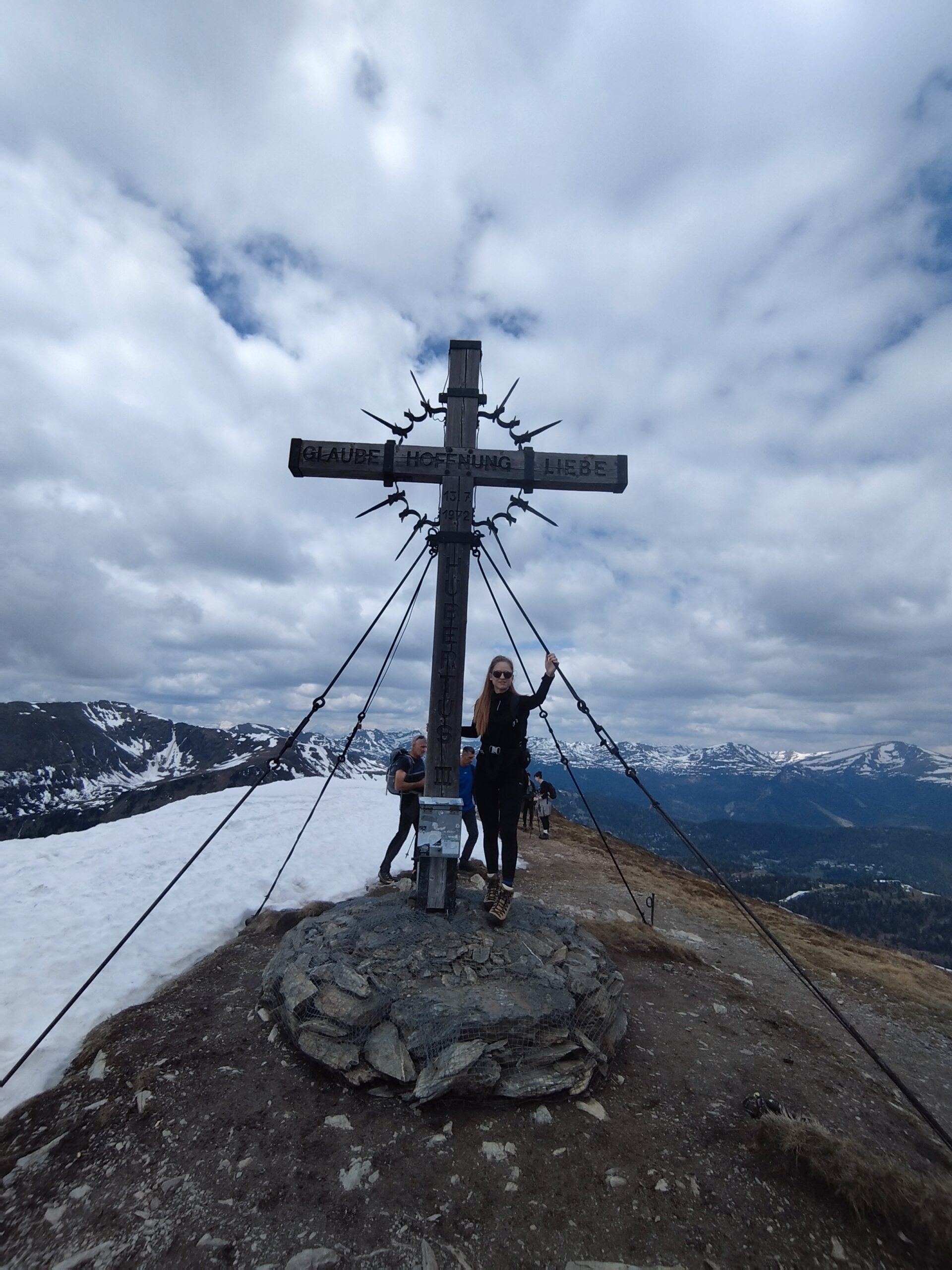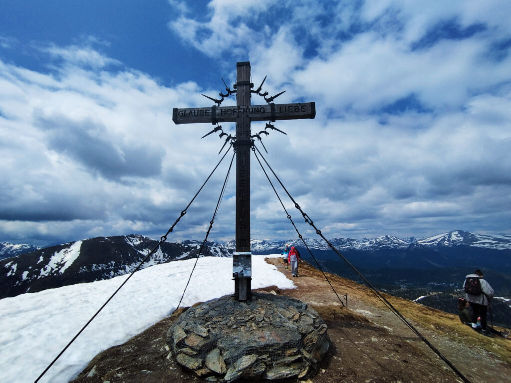 Na vrh smo stigli brzo, mislim da već nakon 1 h. Po putu smo malo izgubili put jer markacije nisu najnovije, a ugaženo tlo se nije vidjelo zbog snijega. Svako malo bismo napravili vrlo kratku stanku da dođemo do predaha pa dalje. Planinarsko društvo je šaroliko po dobi, pa treba misliti na sve. U jednom trenu se pokazao Rinsennock u daljini, rekli smo neki sljedeći put. Svi smo imali osmjehe na licu kada smo izdaleka ugledali križ. Križ je ogroman i metalan s  natpisom “vjera, nada, ljubav”. Na vrhu je bila prva veća pauza, za pojesti, popiti, uslikati se i upijati okolinu. Puhao je vjetar, sunce se pokazivalo na trenutke. Svejedno nas je većina izgorila u licu. I tako nam je Schoberriegel 2208m n.v. bio prvi vrh tog dana. Ali ima li što bolje od više vrhova u jednom danu? Sljedeći susjedni, nešto viši je Gruft 2232m n.v. On je pak označen malim mršavim križem. Ova dva vrha međusobno su udaljena 15-20 min. I dalje smo pazili na mokar i težak snijeg koji se zadržao na sjevernoj strani padine.