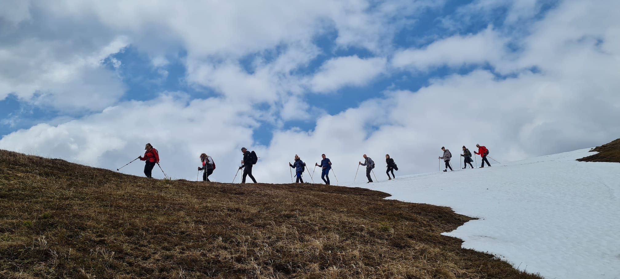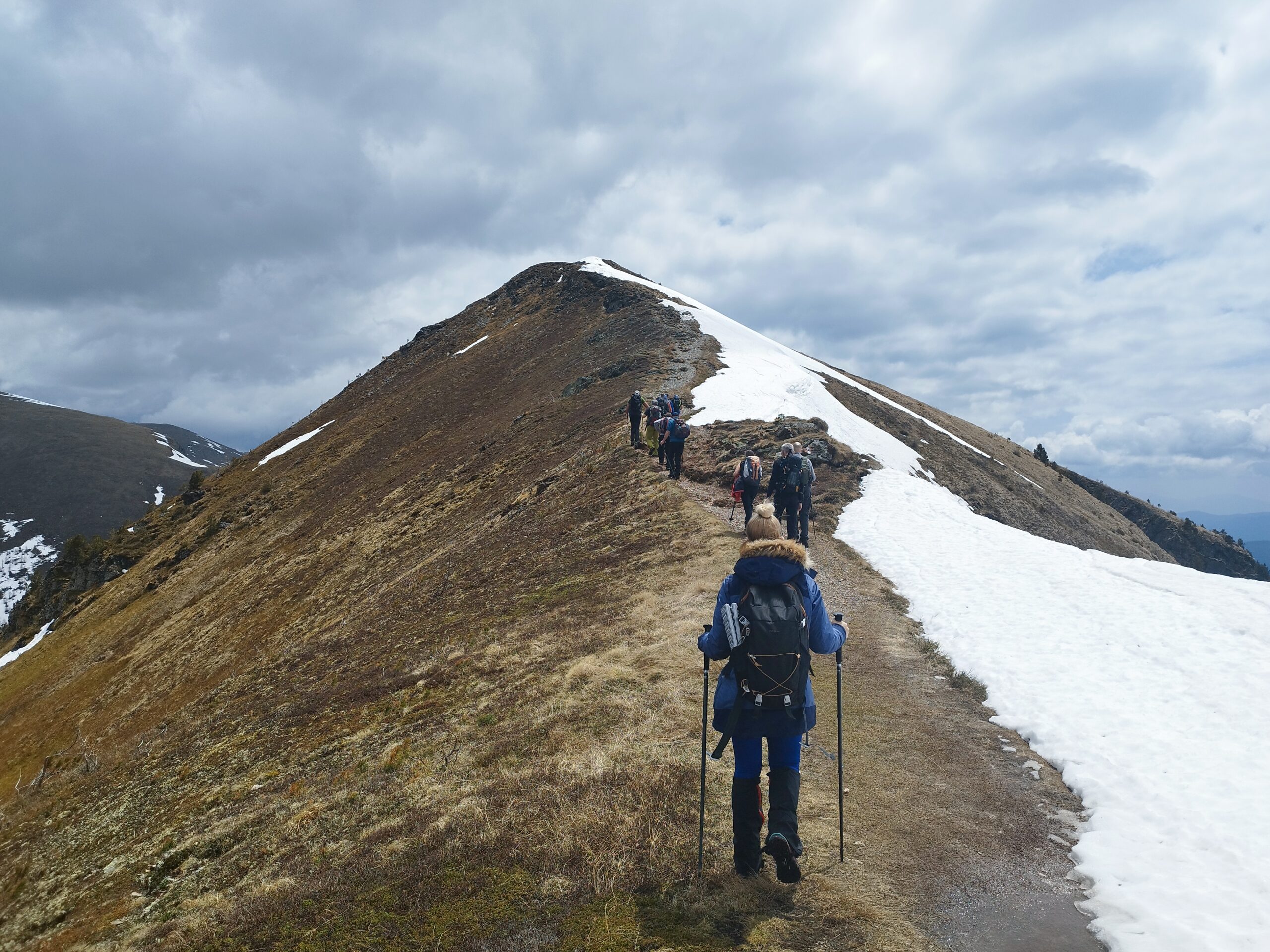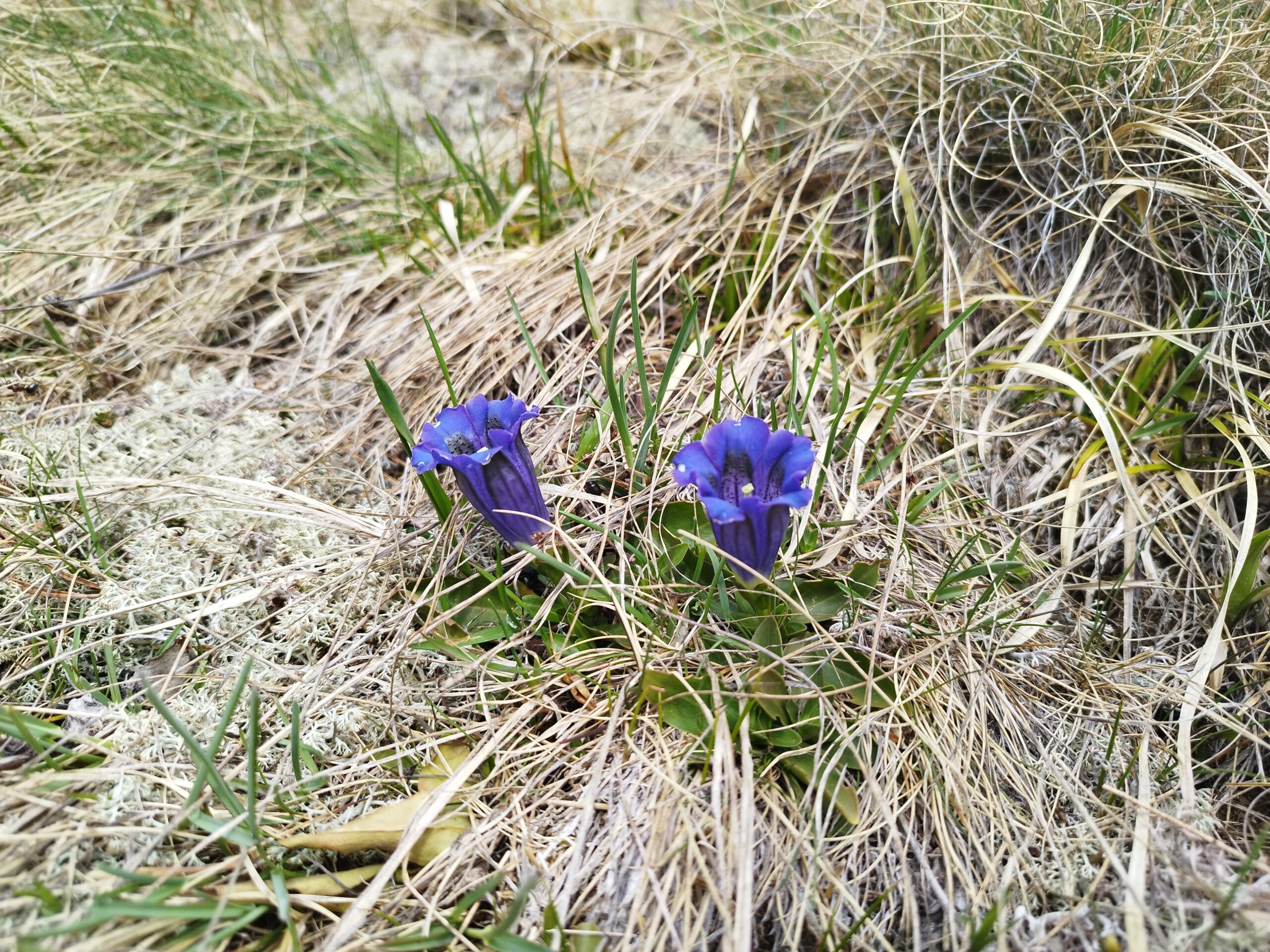 Planinski krajolik podsjeća na Ćićariju – velike površine sa suhom travom. Možda je suha zbog čestog jakog vjetra. Na oba vrha obavili smo grupno fotkanje 😊 Na Gruftu smo postali gladni, ipak smo budni barem od 5h. Krenuli smo prema domu, a usput stali na još jedan vrh iznad 2000 m. Taj je pak najskromnije označen bez vidika, ali usput je, moraš do njega – Schonebennock 2002m n.v. Počeli smo se spuštat, ima snijega, ali ima i predivnog planinskog bilja, poput enciana. Encian je plavo ljubičasti cvijet koji se rijetko viđa, a pridolazi na višim nadmorskim visinama. Stvarno smo bili gladni, a kad pitaš vodiča kolko još, odgovor je 20 min. Vrijeme je relativan pojam.